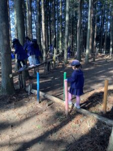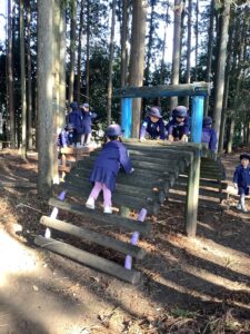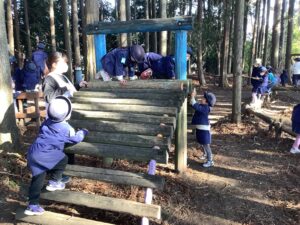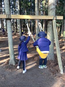縦割りのグループでは、大きい子が小さい子の手をつなぎ、アスレチックのやり方を教える姿も見られました。
