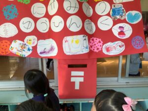 今日からハガキを販売し、子どもたちは、ハガキを書いてポストに入れます。年中組さんは、そのハガキを宛名のもとに届けます。みんな楽しみながらいろいろなことを学んでいきます。この様子はまた何度か紹介します。