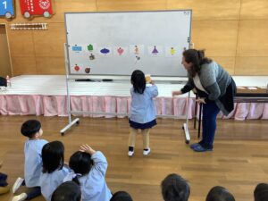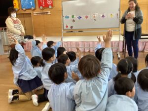 幼児期の英語活動で大切なことは、とにかくたくさんの生きた英語を聞かせることだと言われています。そして、「何となく言っていることがわかる。」「いつの間にかわかる英語が増えている。」となることが理想的です。子どもたちの意欲を第一に考えながら、続けていきたいと思います。