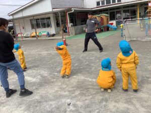 このころになると、みんな歓声をあげながら三森先生を追いかけます。笑顔もたくさん見られます。ころんでも泣きません。見事にネコさんのしっぽをつかまえます。