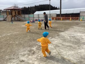 さて、次は三森先生を追いかけます。三森先生はなわとびをしっぽにして、ねずみさんになりました。子どもたちは、しっぽをとり、ネコになり、三森先生を追いかけます。
