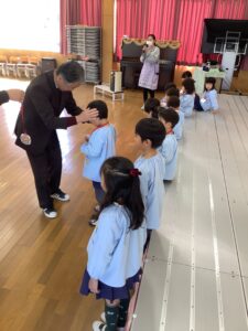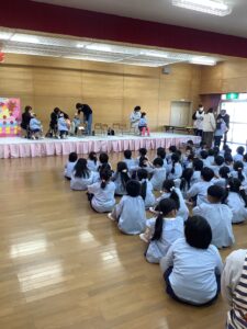 好きな食べ物としては、唐揚げ、いちご、チキンナゲット、ブドウなどがでました。恥ずかしがる子もいましたが、みんな一生懸命に答えていました。立派でした。