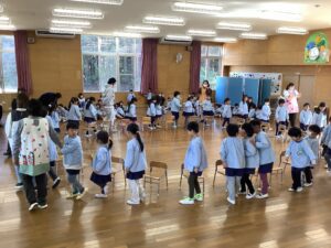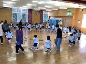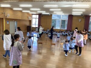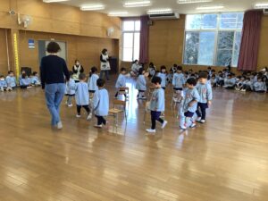 全員で歌をプレゼントしたあとは、お楽しみ会です。今日は椅子取りゲームをみんなで楽しみました。つくし組、年少組、年中組、年長組、それぞれの3位までを決め、その後、決勝戦が行われました。