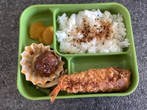 今日の給食の献立は、エビフライ🍤・いんげん竹輪ソテー・ミートボール・みかん缶です。