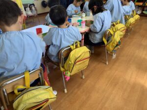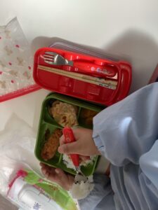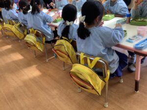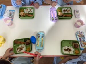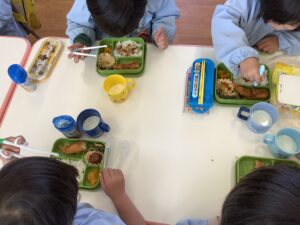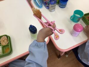 年少組さんでは、トレーニング用のお箸を使っている子が多いようです。だんだんと普通のお箸が使えるようになるよう、みんな頑張っています。スプーンやフォークも使いながら上手に食べています。